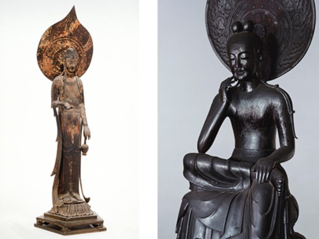 (左)国宝 観音菩薩立像(百済観音) 飛鳥時代・7世紀 奈良・法隆寺 (右)国宝 菩薩半跏像(伝如意輪観音) 飛鳥時代・7世紀 奈良・中宮寺 展示期間:5月20日~6月15日
