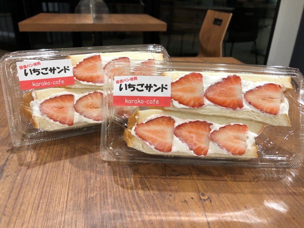 販売商品:フルーツサンド(苺)、カツサンド、フレッシュ苺「古都華」