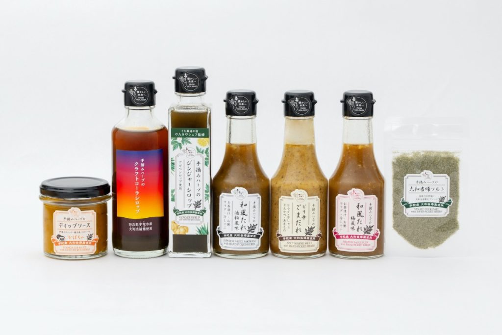 手摘みハーブのディップソース、大和当帰ソルト 、宇陀の大和茶 大和当帰ブレンド、生ひのきの湯 、野草の湯 、大和当帰と宇陀牛のカレー
