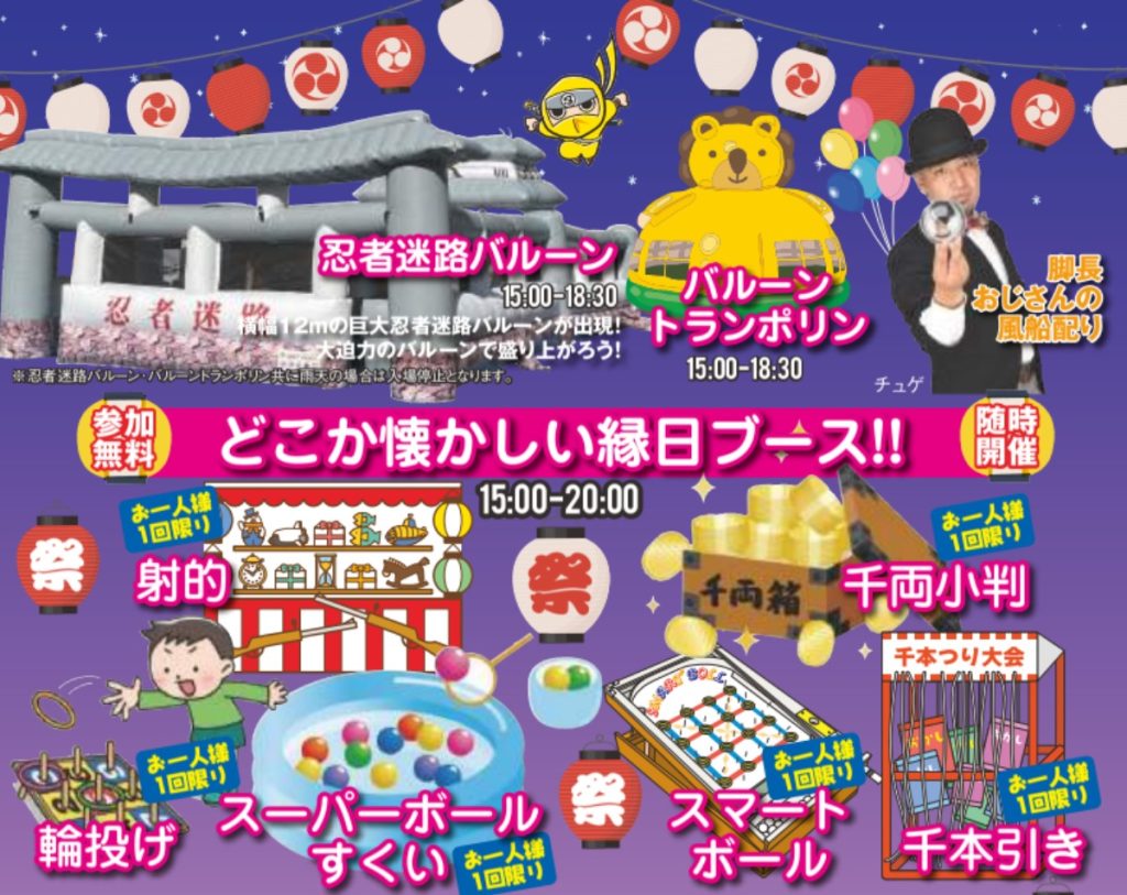 高さ3メートルの脚長おじさんの風船配りや、どこか懐かしい縁日ブースなども登場。