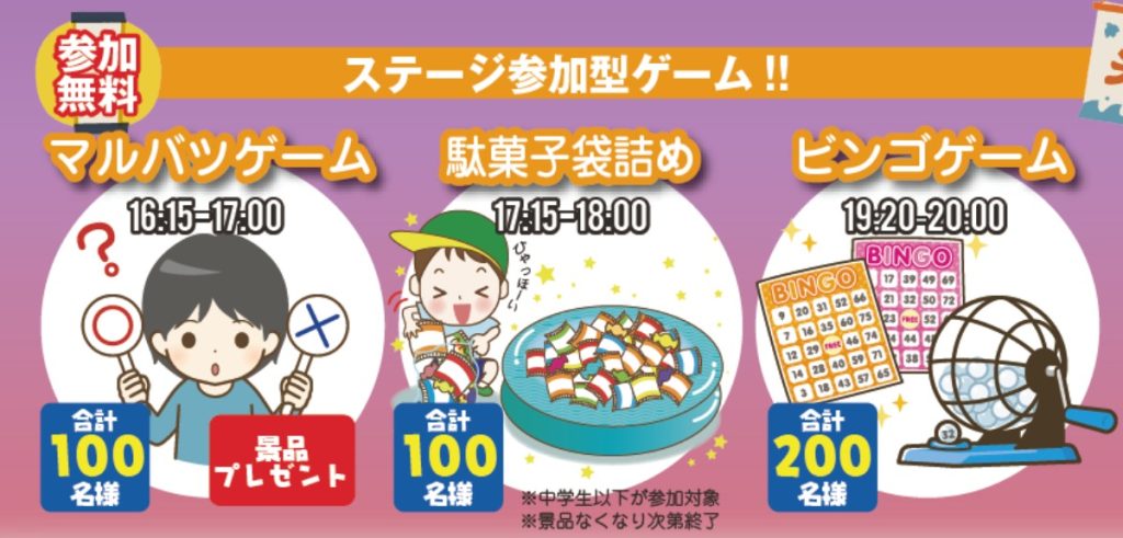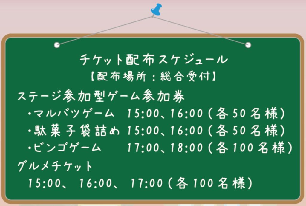 ※ステージ参加型ゲームは参加券制。ステージ参加券、グルメチケットはお一人様1枚となります。配布時間は前後する可能性があります。予めご了承ください