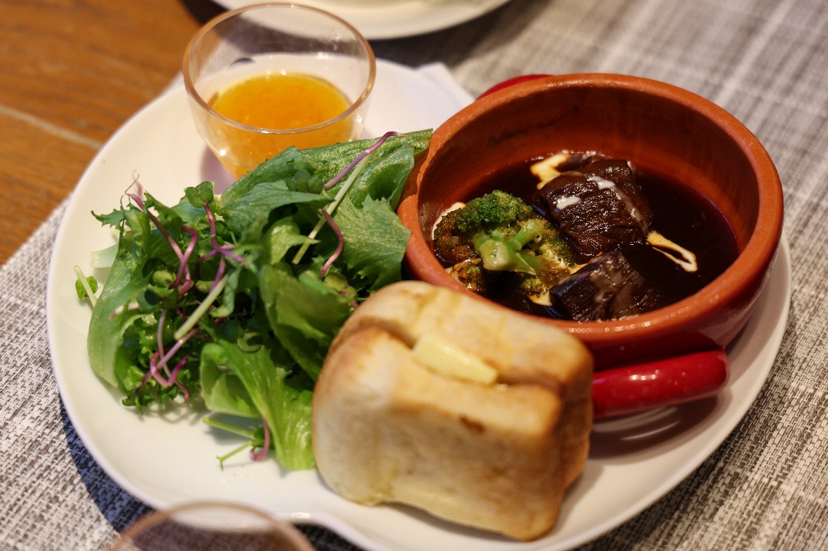 下段のプレートには、国産牛のシチューとパン、サラダ。パンは店内で焼かれた自家製。