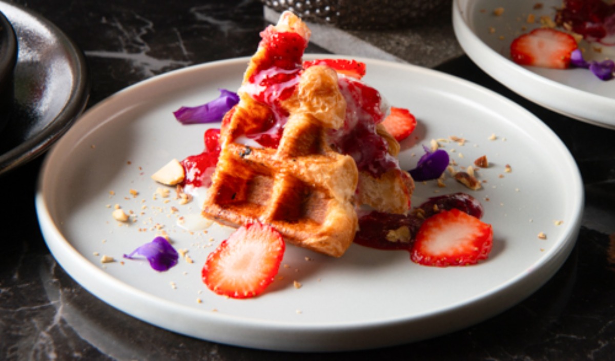 フランス産発酵バターのクロッフルは、バター香るサクサク食感のクロッフルと苺・ナッツ・練乳の相性が抜群。