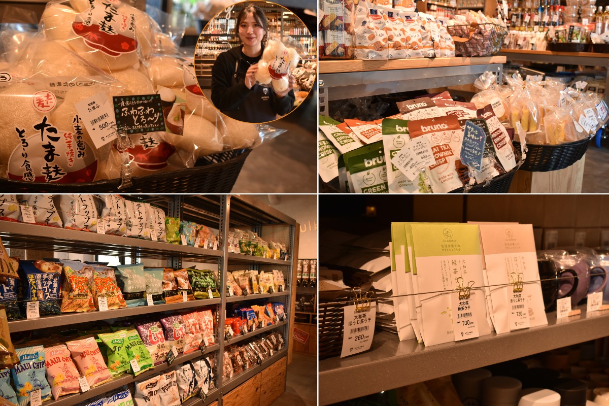 各国・各地域から仕入れた品物が並ぶ。写真左上は店長おススメの“たま麩。写真右下は奈良の大和茶を使ったラテ。