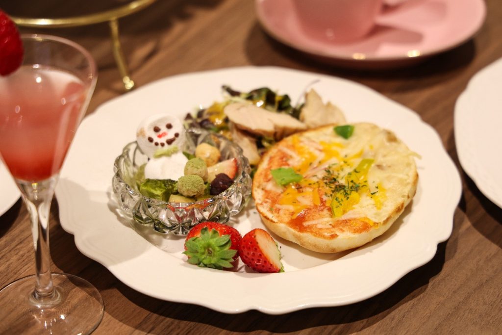 抹茶&ベリーの和スイーツやグリーンサラダ、2種のピザバケットで、甘い・しょっぱいのリズムが心地よく続きます。