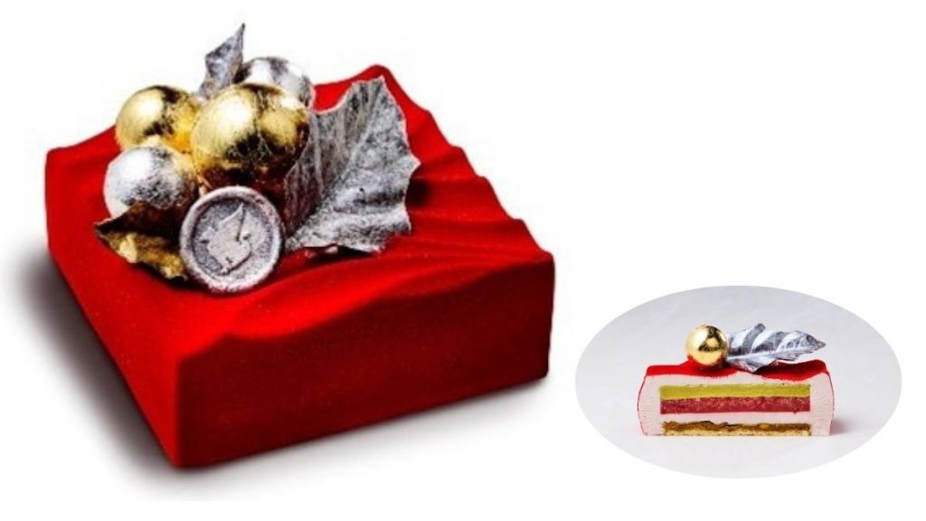 なめらかにとろけるストロベリームースに、香ばしいピスタチオクリスピー、ふわりと軽やかなスポンジが重なり、一口ごとに味わいと食感の立体的な奥行きを楽しめる。