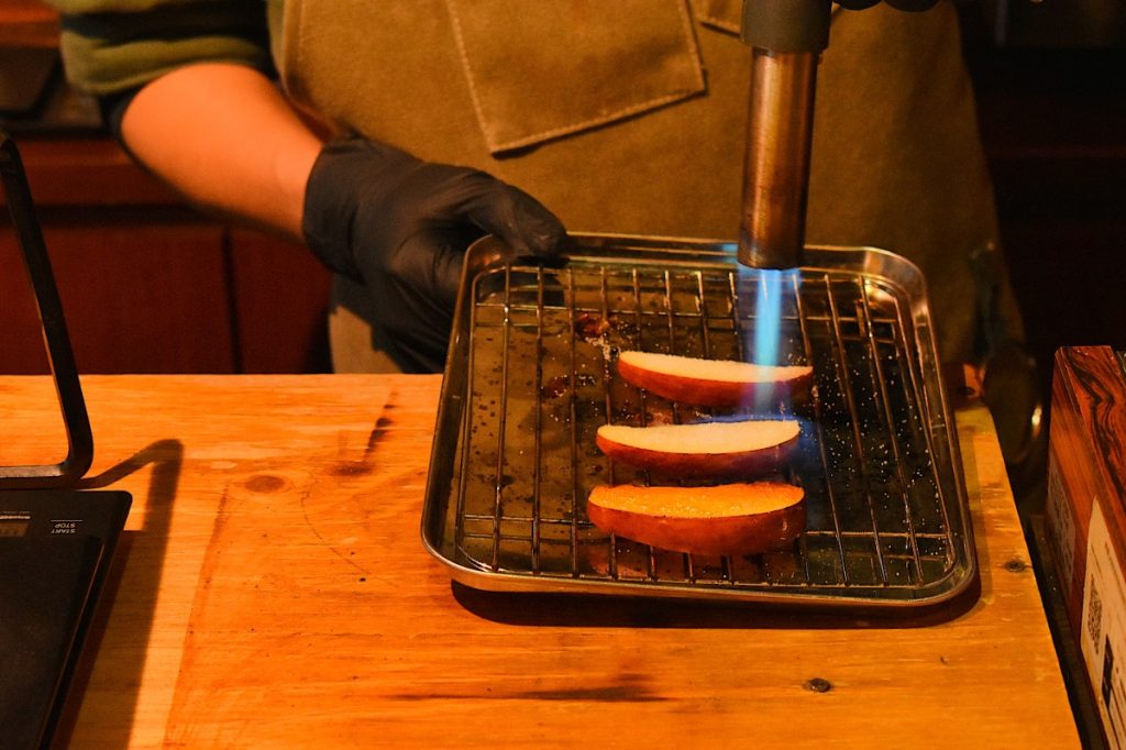ブリュレされたリンゴの甘さとパリッとした食感、シナモンと一緒に煮込まれたリンゴのコンポート、クリームの下に仕込まれたコンフィチュールはクローブで香りづけされている。