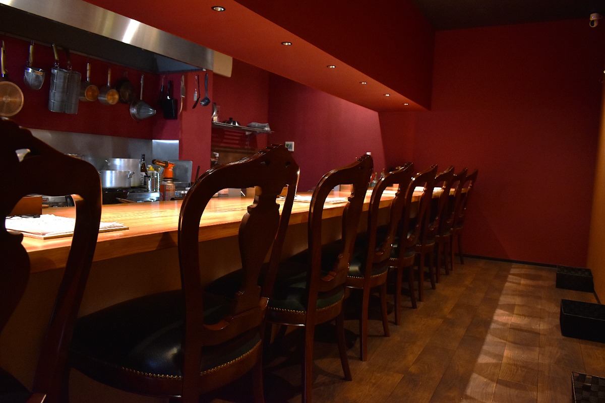 中に入ってみると、こちらも赤を基調としたデザインに一枚板のカウンター、クラシックなデザインの椅子、席ごとに設置されたピンスポット照明など、洗練された空間が広がる。