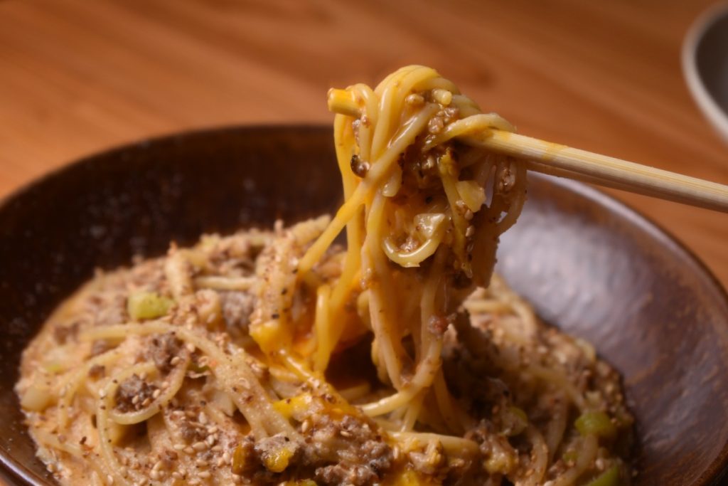 こちらの坦々カルボナーラは、汁なし担々麵の肉味噌とタレをカルボナーラに合わせたような塩梅。