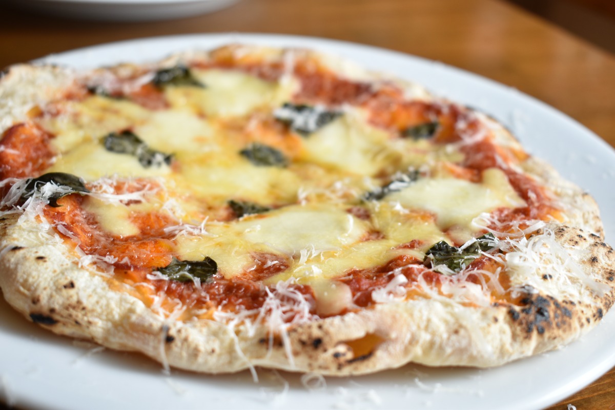 電気オーブンで焼き上げられているのだが、小麦の配合や生地の発酵時間などを調整することで、まるで窯焼きのナポリピッツァのような焼き上がりとなっている。