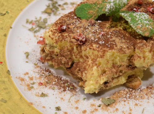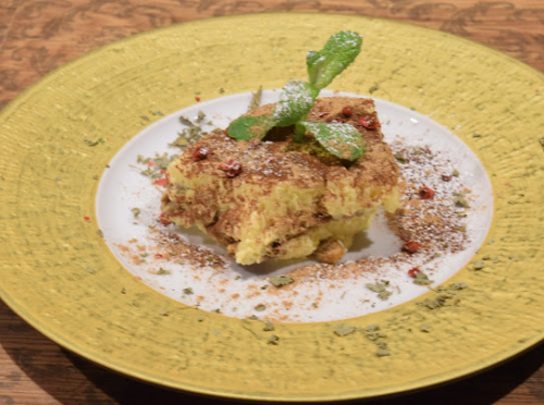 スパイシーなカレーを味わったあとは、デザートもおすすめ。ティラミスとスパイスを合わせる発想には、最初は皆さん驚くかもしれませんが、濃厚なティラミスの味わいを活かしたまま、スパイスの香りがどこかエキゾチックさを演出する、とても上品で心落ち着くひと皿です。