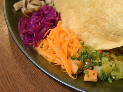 奈良で採れた旬の野菜を中心に使用した、色鮮やかな副菜がたっぷりのひと皿。