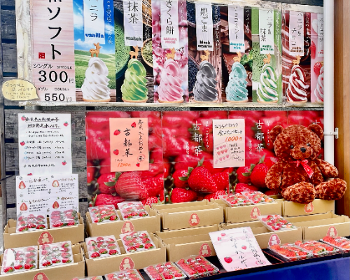 店頭では、いちご大福だけではなくソフトクリームやパフェ、その日によっていちごのパック売りなど、メニューも充実♪
