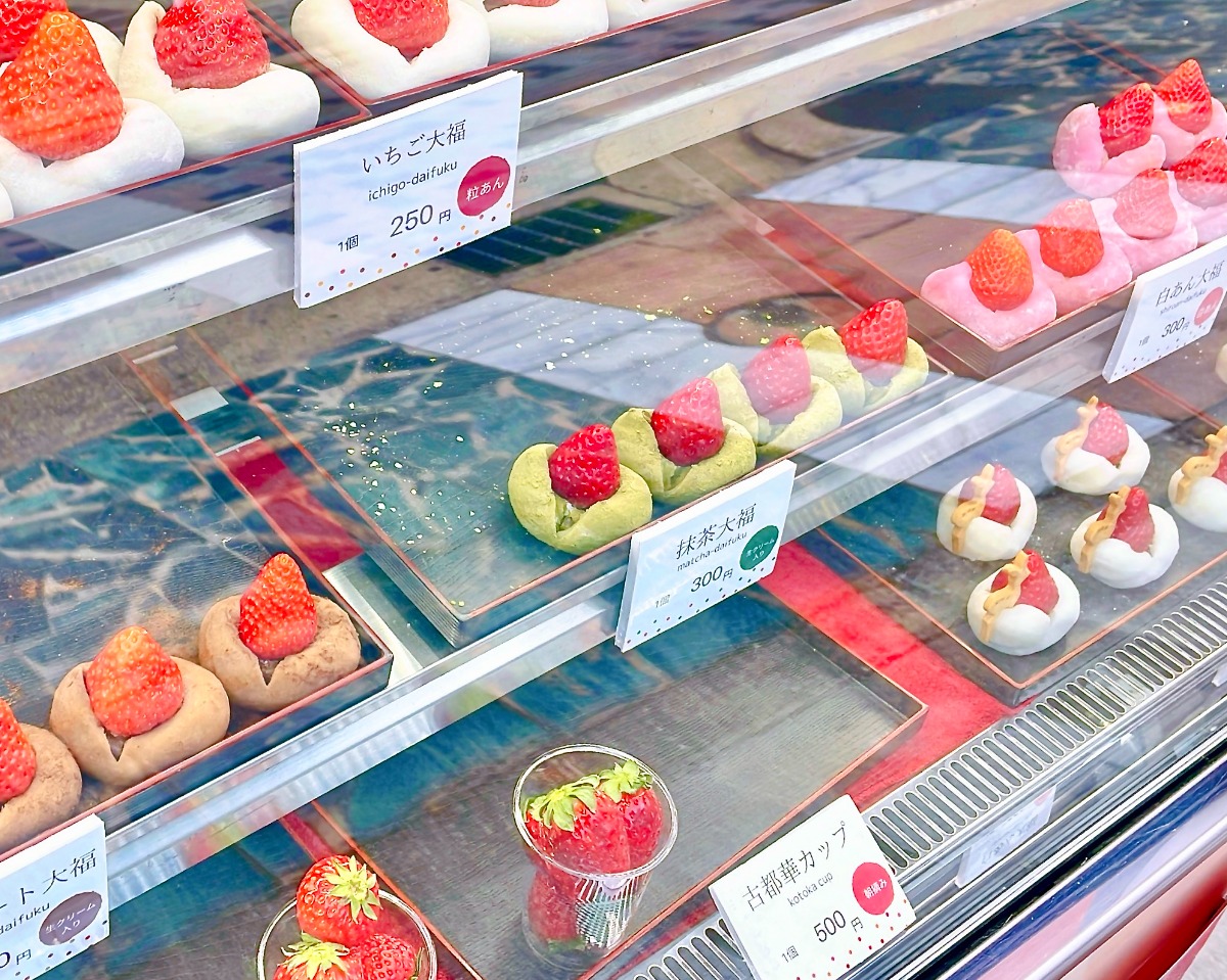 ショーケースのいちご大福は彩り鮮やかでどれもおいしそう!