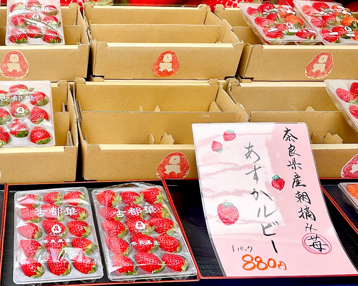 まずは「BIGいちご大福」からご紹介。 ずっしりとた、通常のものよりひと回り大きい大福。 ジューシーないちごとつぶあん、やわらかくてもちもちのおもち。 それぞれの旨味が口の中いっぱいに広がって幸せな気持ちに! いちごとつぶあんは甘さ控えめで、何個でも食べられそう♪ そして、「ことかBIG大福」! つぶあんとおもちは「BIGいちご大福」と同じもので、 上に乗っているのは、奈良県産のブランドいちご「古都華」♪ まるで宝石のような、ツヤツヤのいちごは見た目も格別。 口に入れた瞬間、みずみずしく甘みたっぷりのいちごの味! その後に酸味が感じられる不思議な「古都華」にハマりそう。