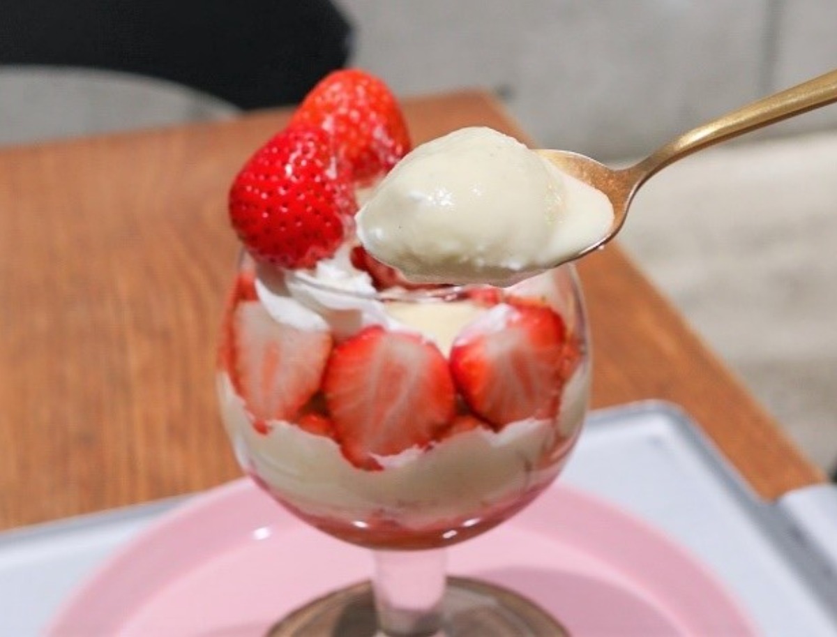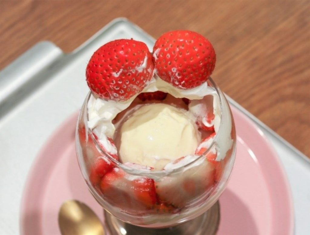 注文を受けてから1つひとつ丁寧に作られるパフェ。いちごの山の下にはバニラアイスクリームがたっぷり。