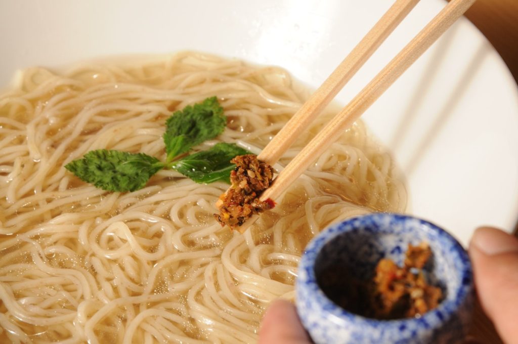 「生七味を食べるためのラーメンでもあるんです。」と支配人の山本さん。 代謝を高め、血行促進効果があるとされる生七味。 スープにこの生七味を溶かし入れて食べてみて。 辛さがプラスされ、ピリリと舌に心地よい刺激が! おいしく、からだにうれしい一杯をぜひご賞味あれ。