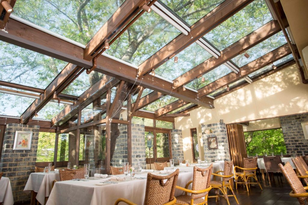 ガラス張りの店内からは、桜、新緑、紅葉など四季折々の景色を楽しめる。