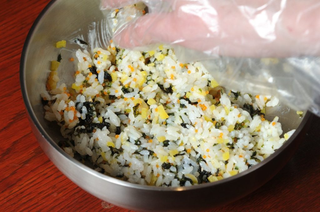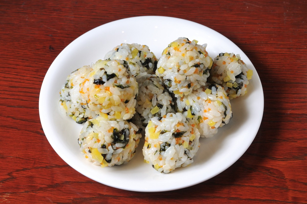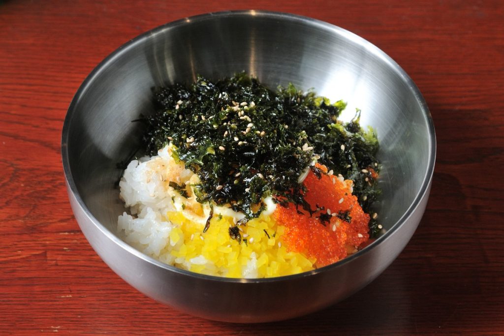 “チュモク”は「握りこぶし」、”パプ”は「ご飯」を表す、要はおにぎりのこと。 ごま油が染みた韓国のりやたくあん、とびこをしっかりと混ぜて握る。