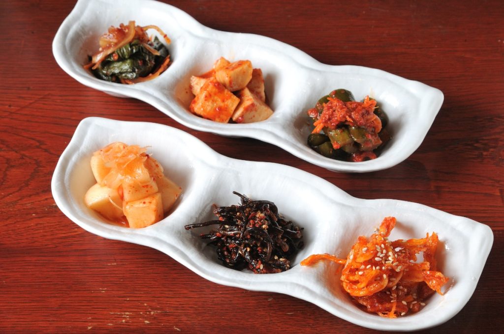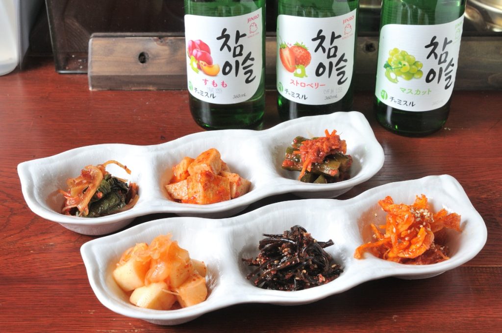 左奥より、ケンニプ(えごま)・チャンマ(山芋)・オイソバキ(きゅうり)。左手前より、ム(大根)・トッ(ひじき)・オジンオ(スルメイカ)。