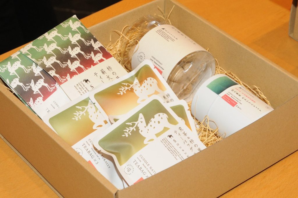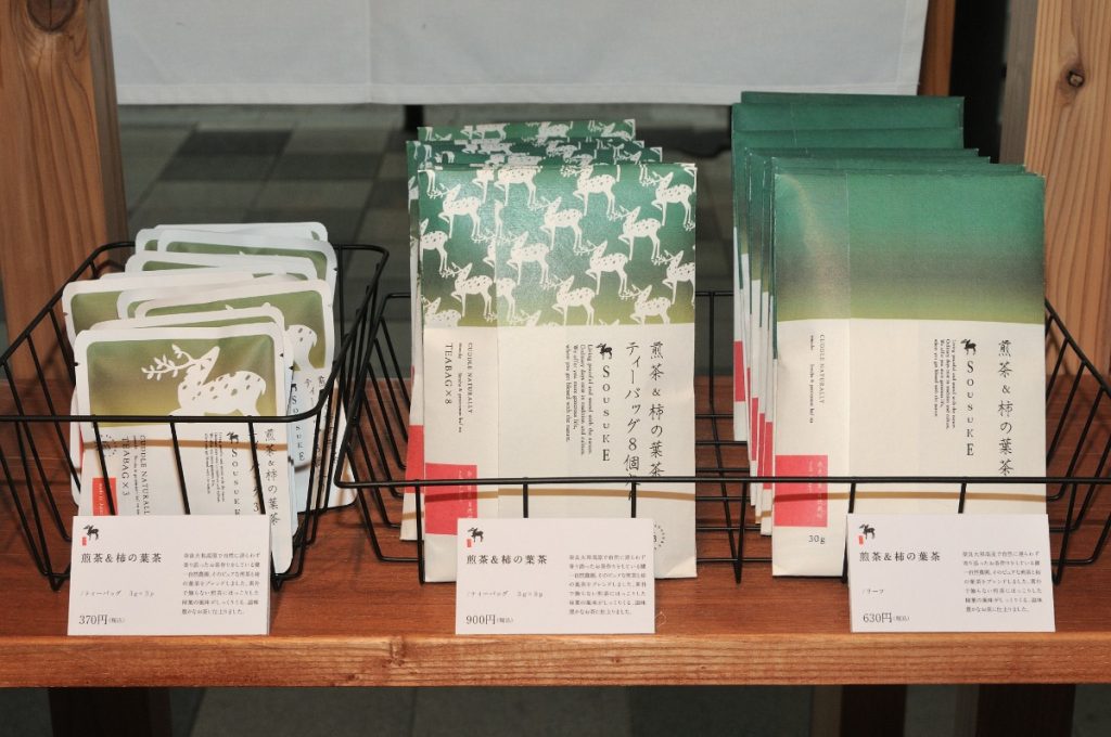 お茶はもちろん、マウススプレー、石鹸など様々な柿の葉を使用したアイテムが並ぶ。