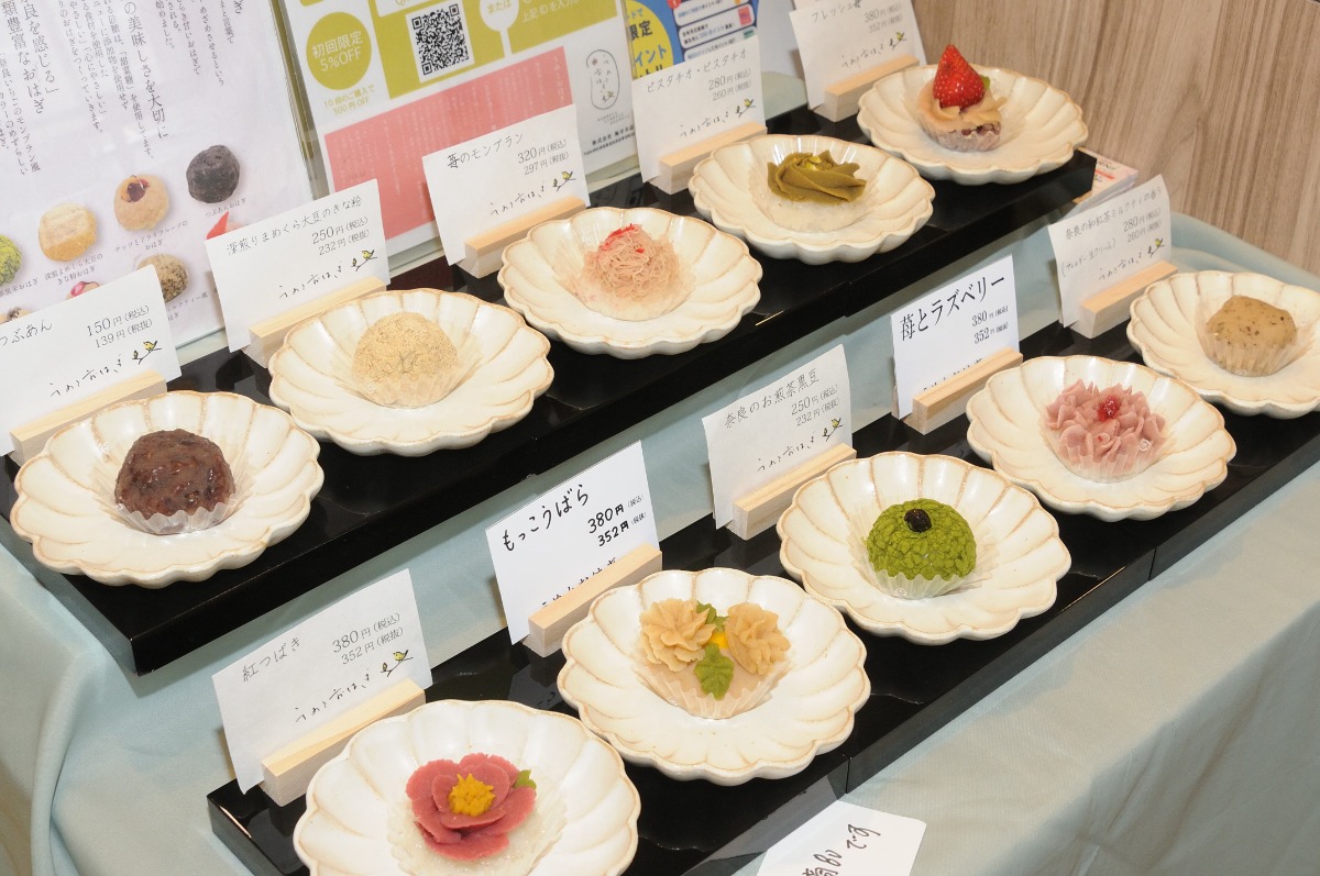 わさび葉を巻いた「わさび葉寿司」が人気の『うめもり』の隣に、今回新たにおはぎの専門店『うめとおはぎ』が併設された。