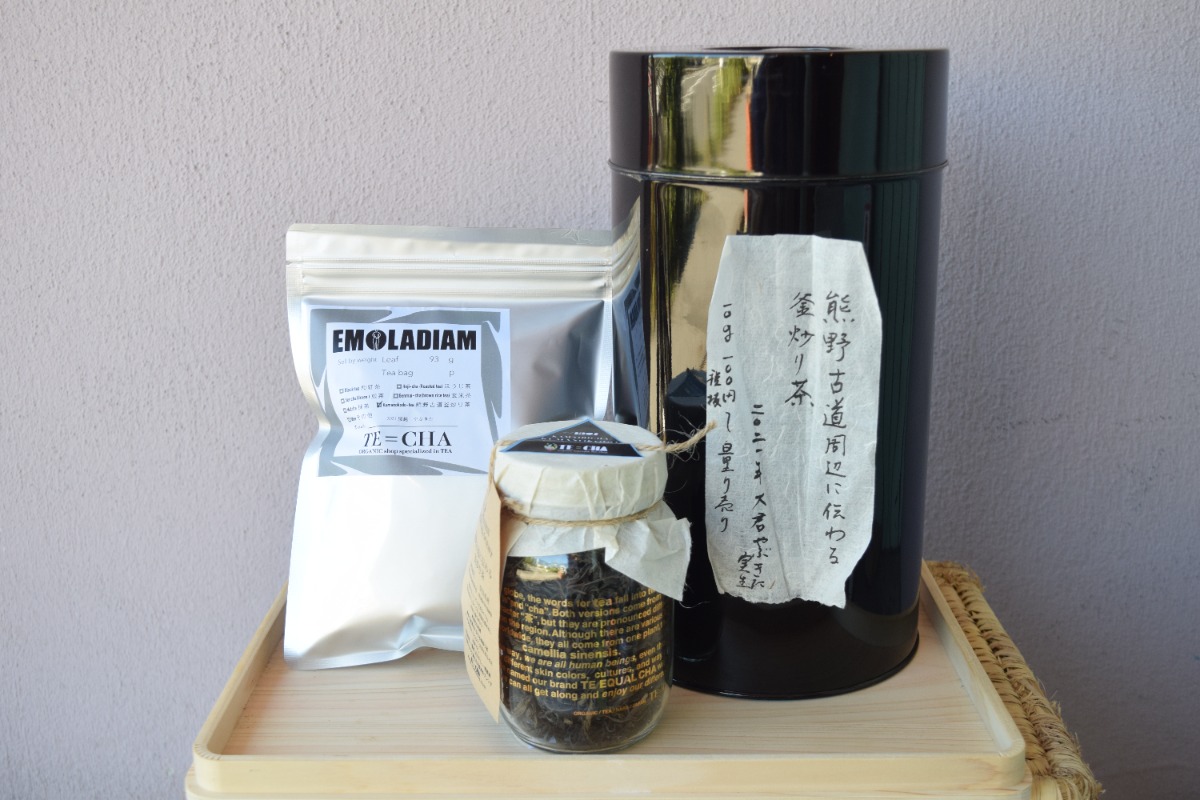 【熊野古道の釜炒り茶】左から:袋入り1521円/瓶1,836円/量り売り10g108円〜(全て税込)