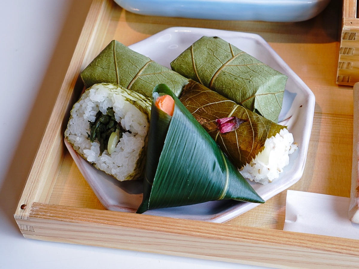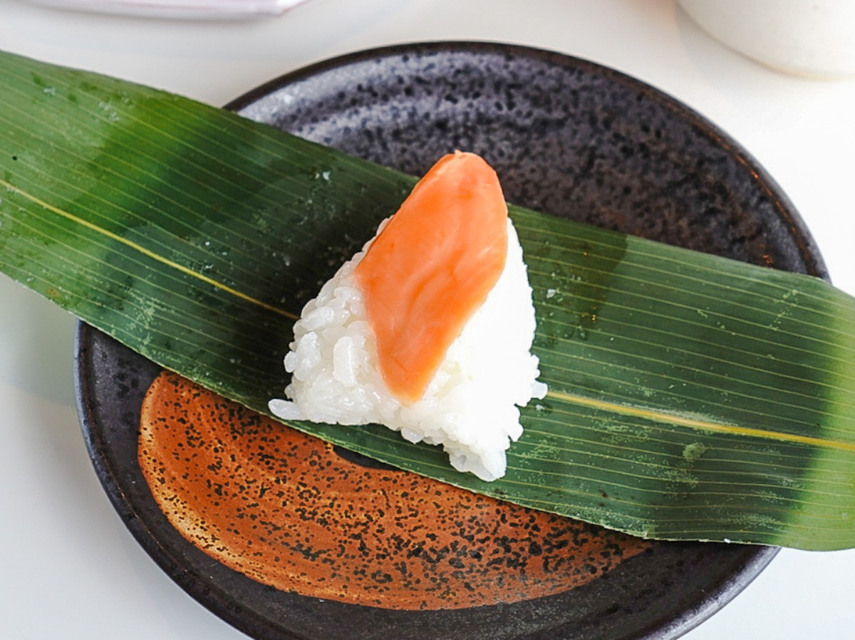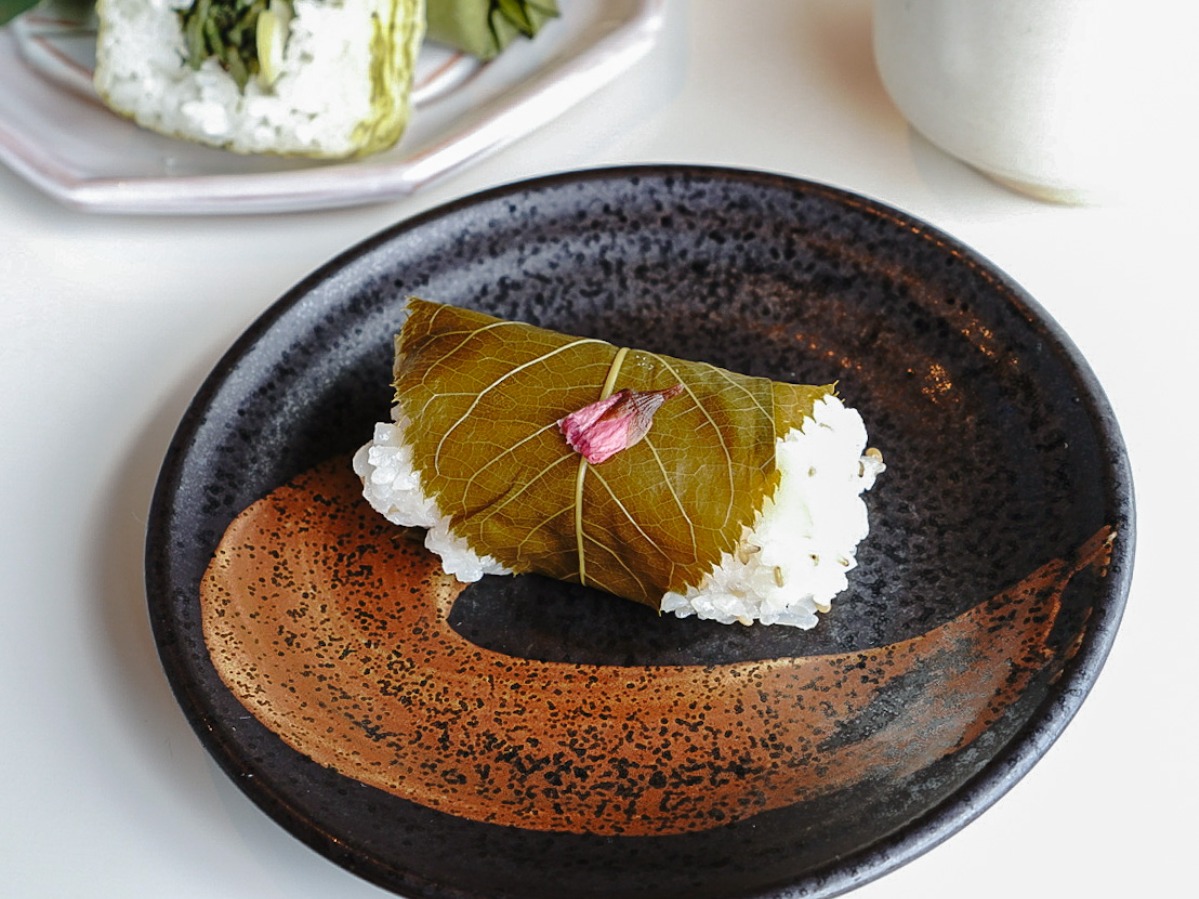 桜の葉で包まれたお寿司は、吉野の桜からインスピレーションを受けたもの。生姜と白胡麻入りのシャリと真鯛が塩漬けの桜の葉で巻いてあります。