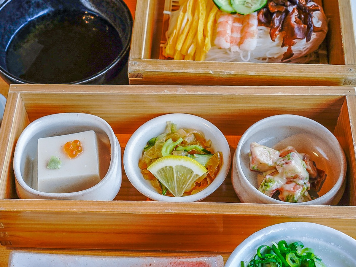 小鉢の中の一品「ごま豆腐」は吉野葛入りで、とてもなめらかな食感でおいしいですよ。
