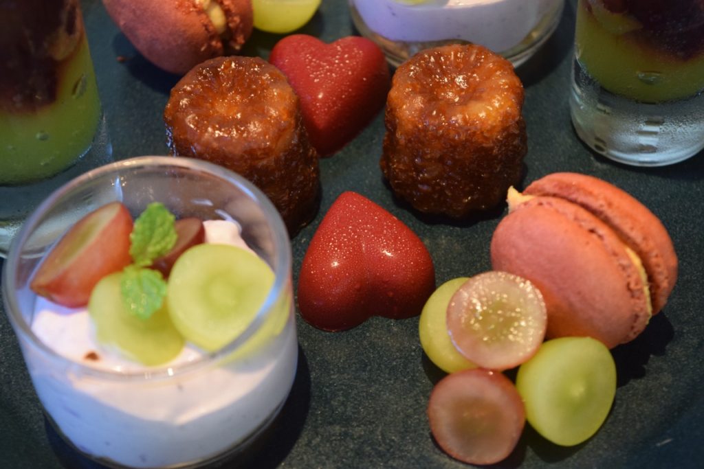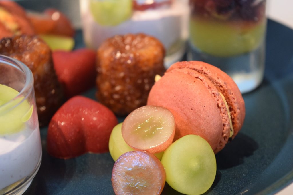 「3種のチーズマカロン 葡萄とマスカット添え」見た目もかわいいマカロンはやさしいチーズの香り。