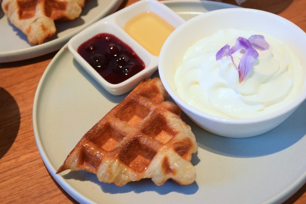 「フランス産発酵バターのクロッフル」は、焼きたてを運んできれくれるのでサクサク感がたまらない。