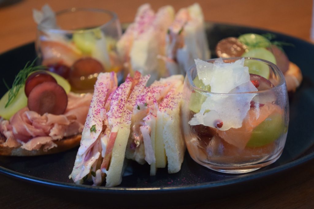 「プロシュートと葡萄・マスカットのタルティーヌ」は、パンに塗られたブルーベリーソースの酸味とプロシュートの塩味、葡萄とマスカットの甘みがまさに三位一体となった贅沢な味わい。