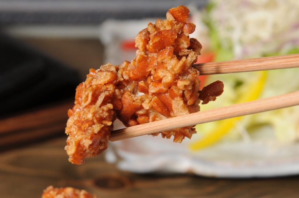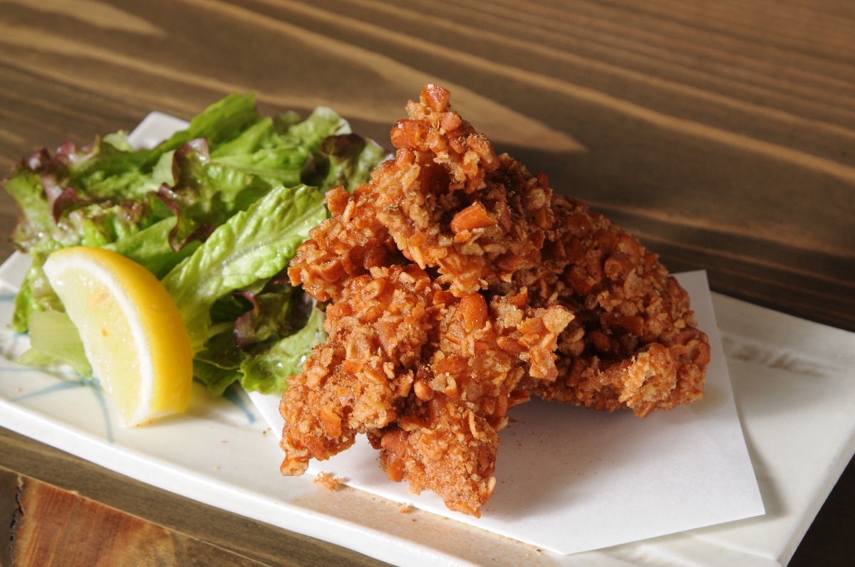 鶏むね肉に柿ピーを絡ませた、サクサク食感の竜田揚げ。