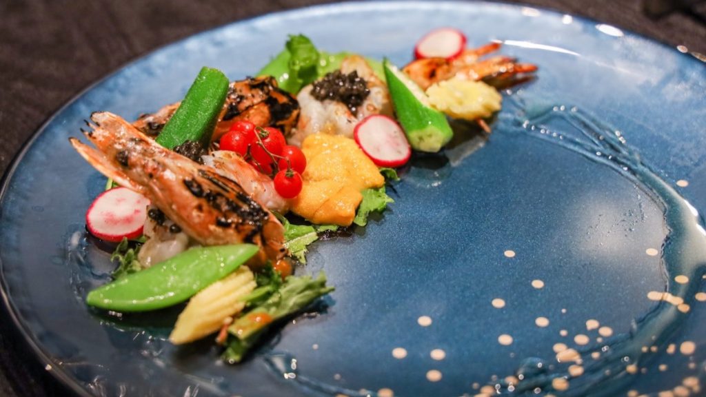 〜 ニューカレドニア産天使の海老のカルパッチョ イタリア産キャビアと北海道産生雲丹を添えて〜