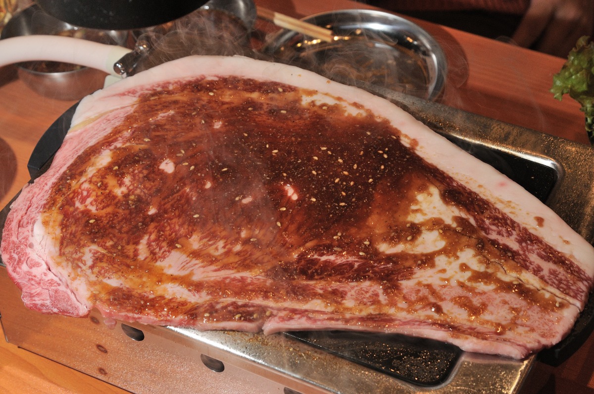 黒毛和牛リブロースが、鉄板からはみ出るほどの巨大サイズ!