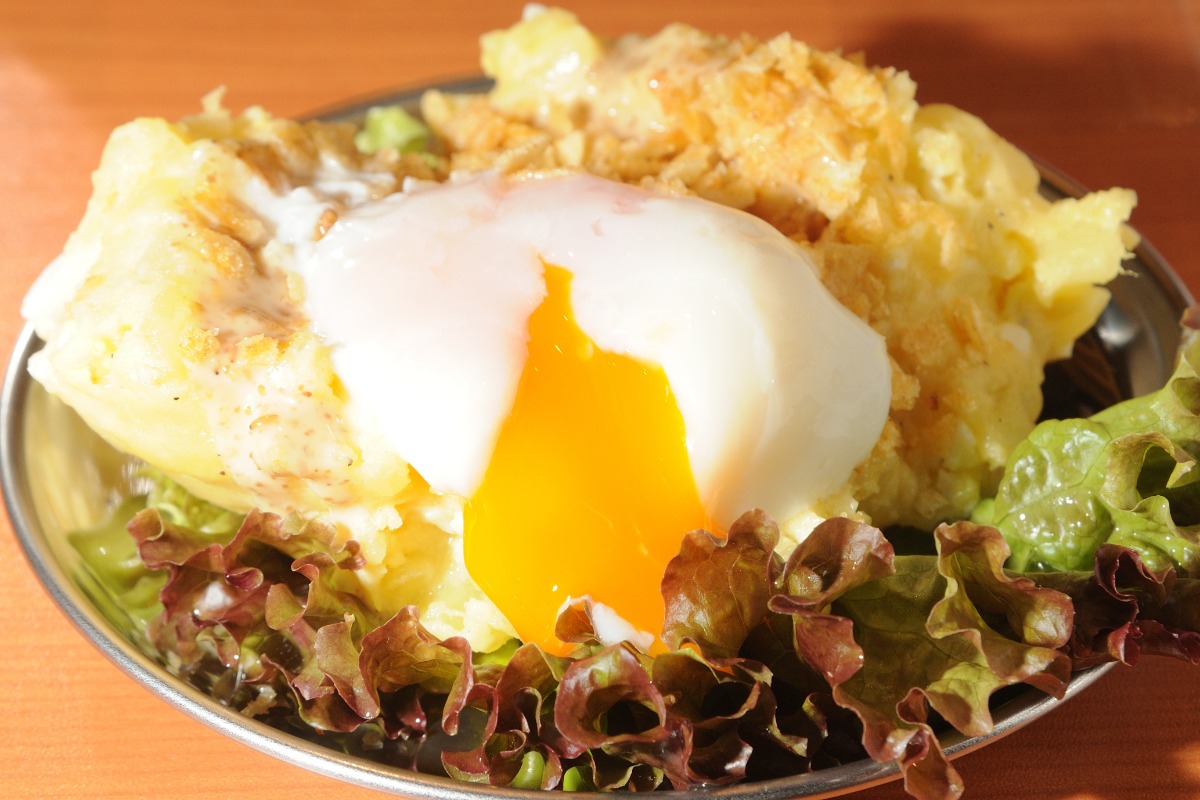 ポテトチップスが、食感と味にアクセントを与えてくれる。