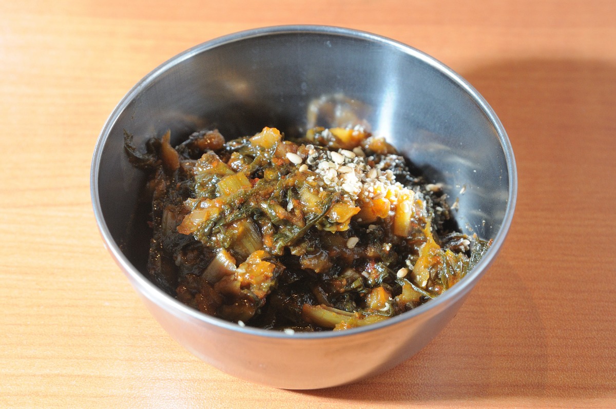 つぶすことで、味をしっかりとしみ込ませた野沢菜キムチ。