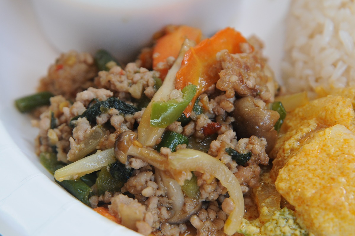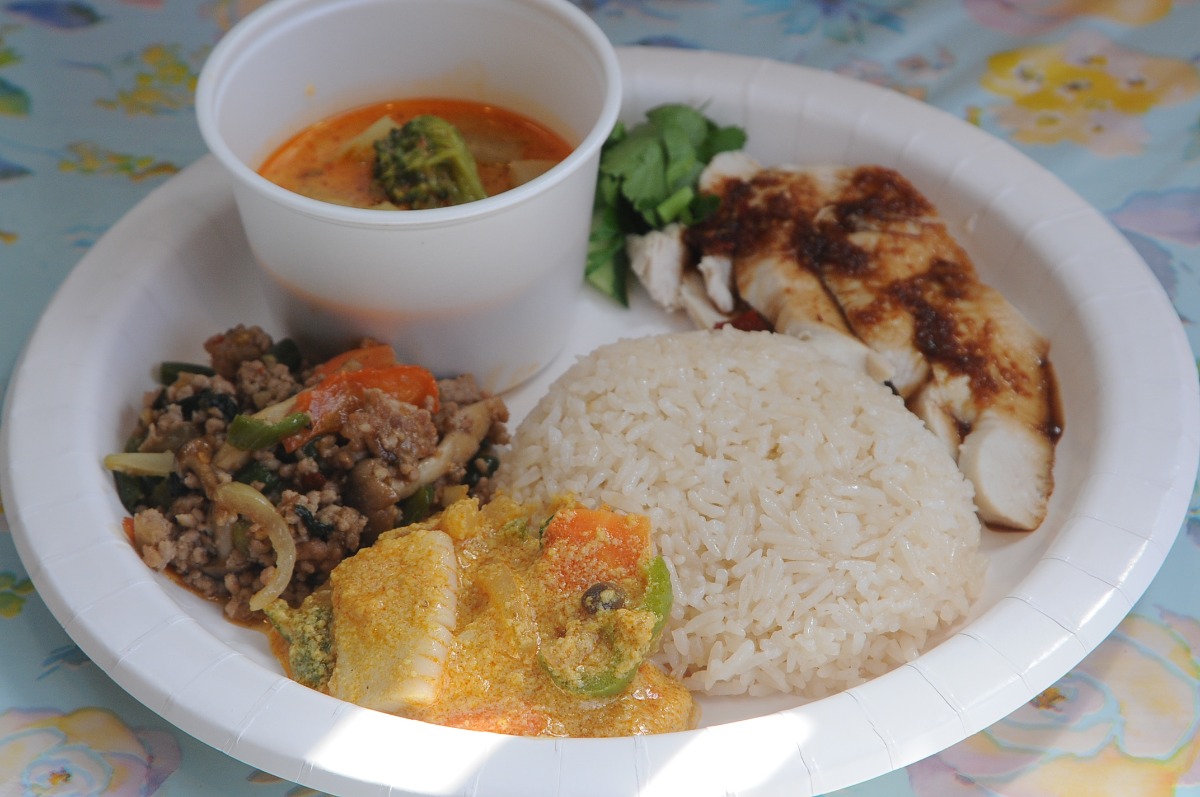 メインを日替わりカレー、カオマンガイ、ガパオライス、イカカレー炒めから選び、そこから2品、3品と増やしていくことが可能。