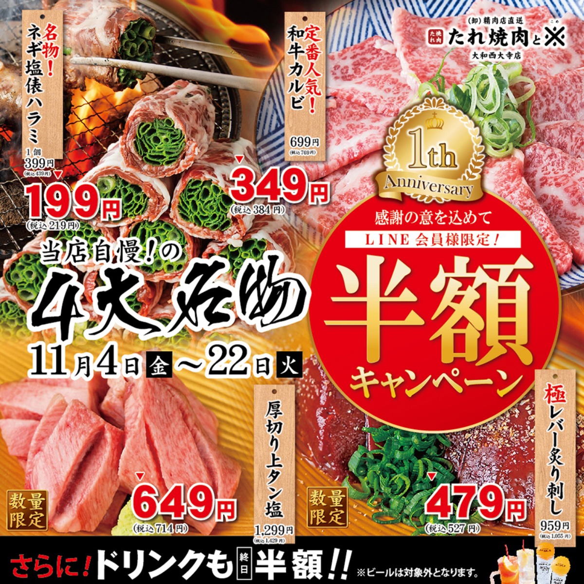 【内容】4大名物メニュー&ドリンクメニュー(一部を除く)終日半額