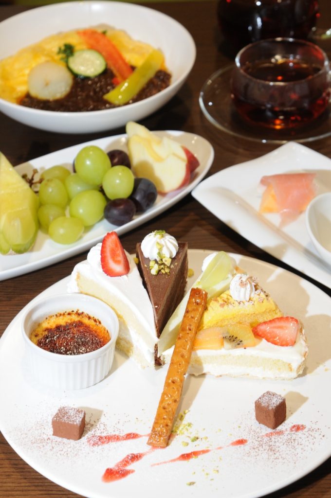 ウェルカムプレートから始まり、パスタやオムライスなど選べる食事メニュー、旬のフルーツたち、スイーツ7種類。