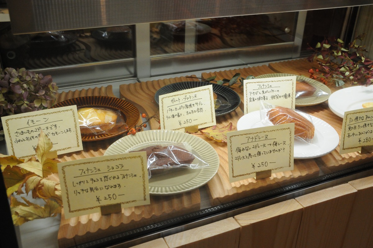店内に入ると、スコーンやフィナンシェなどのおやつが、ショーケースの中からあなたをお出迎え。