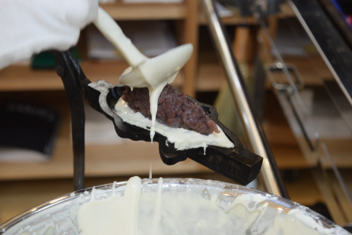 ぎっしりと乗せたあんこの上に生地をかけて挟んで焼く。