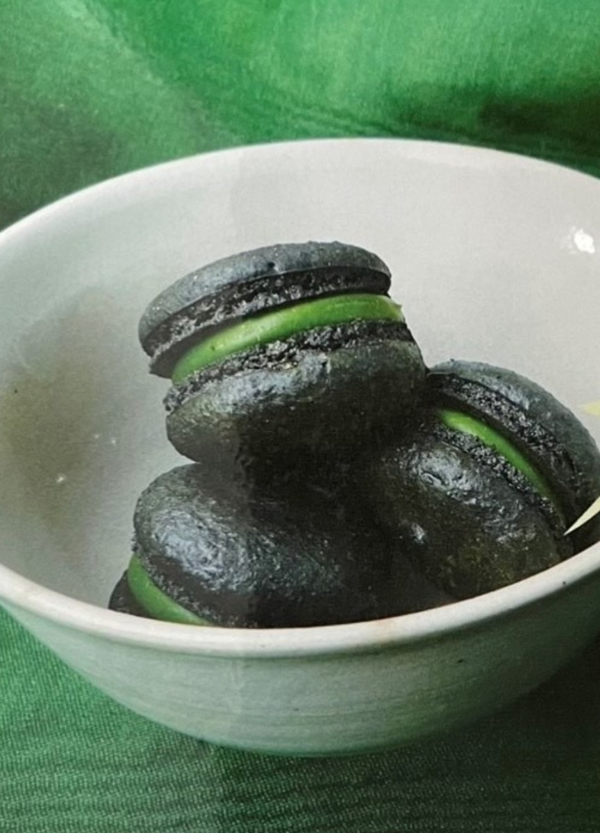 生地に竹炭が入っており、中には高級な大和茶の抹茶とホワイトチョコレートのガナッシュクリームがサンドされている。