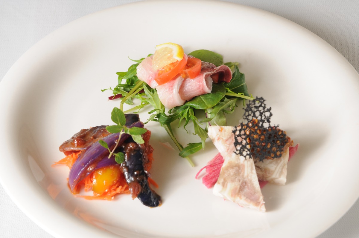 取材時の前菜は、寒ブリのカルパッチョ・無農薬野菜のラタトゥイユ・豚の足とほほ肉を使ったパテ。