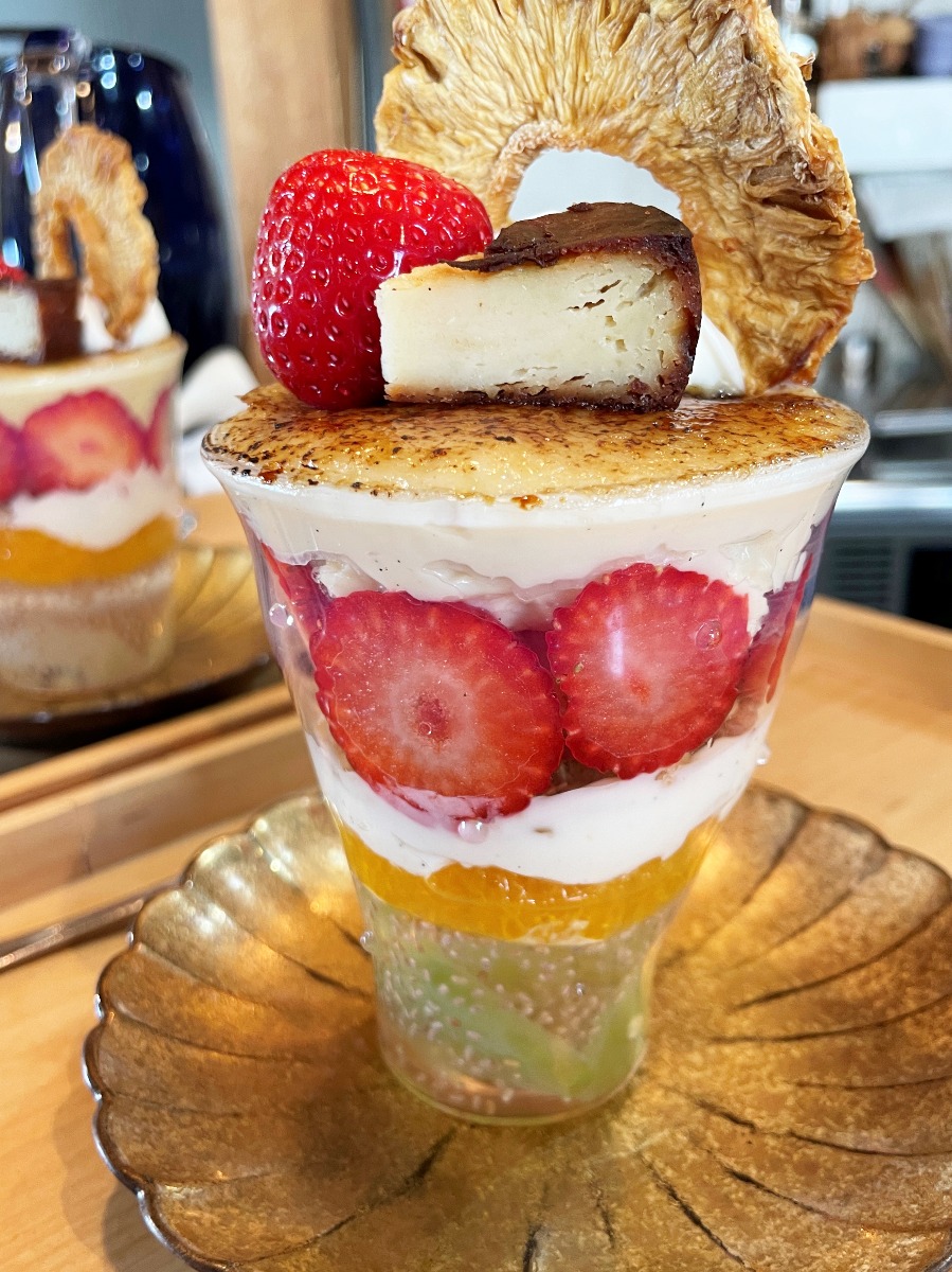 季節の美味しいフルーツを使ったプラントベース&グルテンフリーの「フルーツブリュレパフェ」。