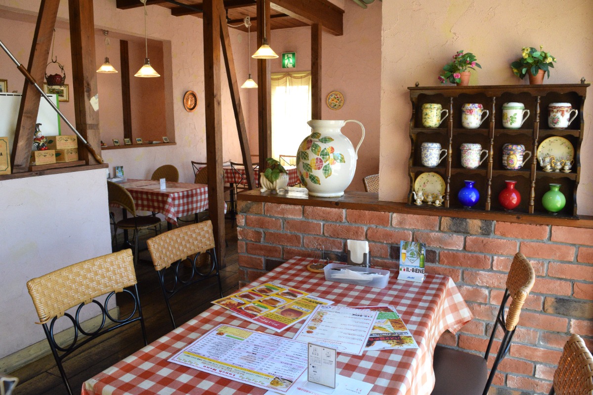チェックのテーブルクロスに、イタリアの雑貨が随所に飾られまさに、イタリアを彷彿とさせる店内。