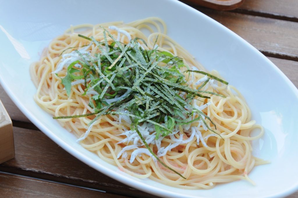 プチプチ楽しい明太子としらすの和風パスタ。
