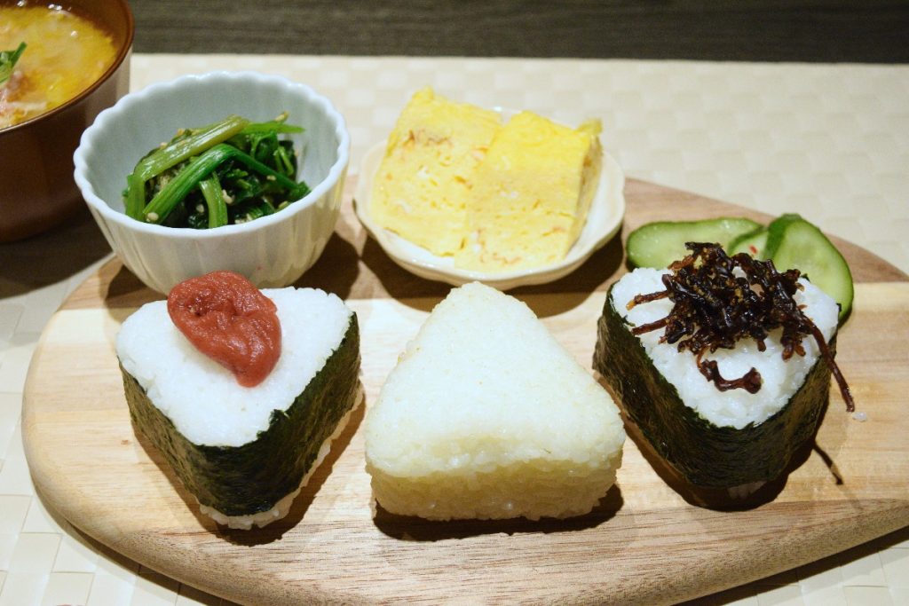 おにぎりをメインに、惣菜や豚汁など家庭料理のランチプレートを楽しめる。