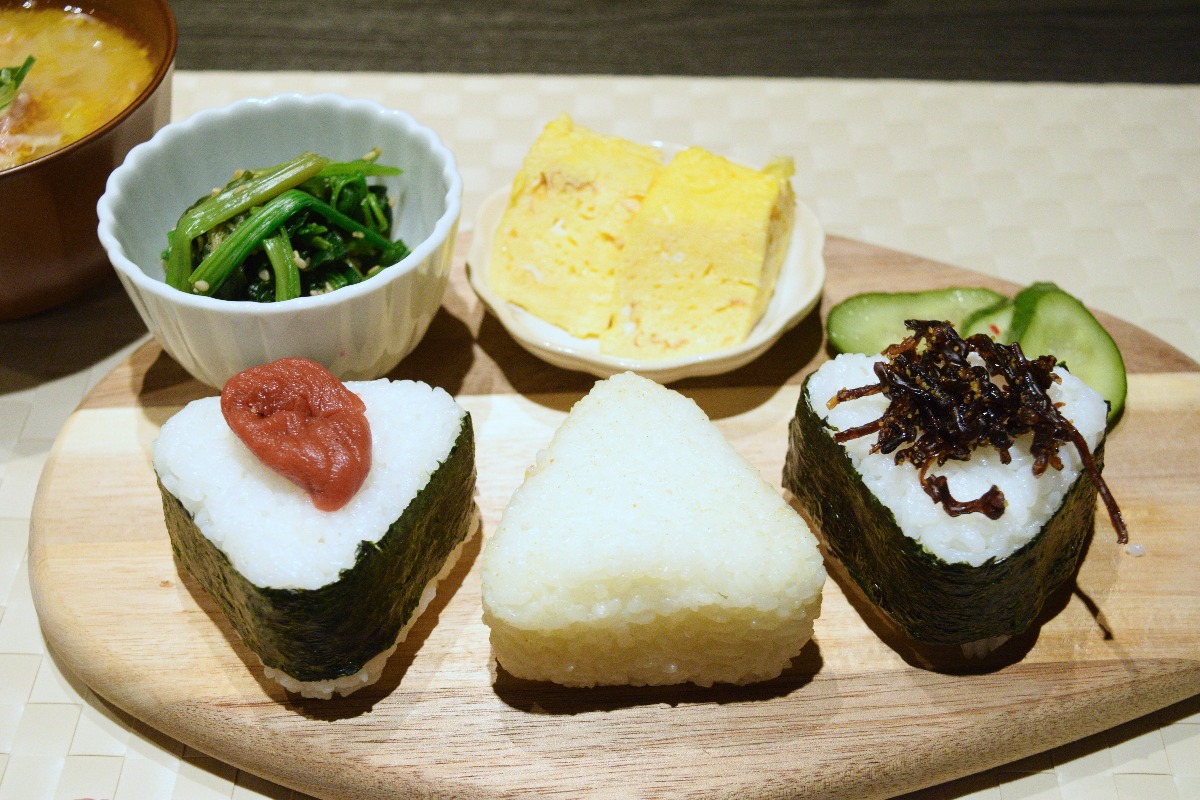 日替わりのおむすび3種と、副菜、つけもの、豚汁がついたヘルシー定食。