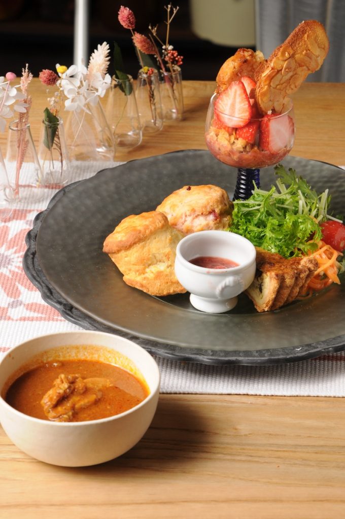 スコーンとサラダ、キッシュ、パフェ、チキンカレーと盛りだくさんなラインナップできっとあなたも大満足!
